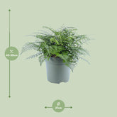 Vorstellung der Asplenium Parvati, auch bekannt als Spleenwort. Diese exquisite Zimmerpflanze ist ideal für Innenraumliebhaber, die einen Hauch von Natur in ihren Wohnräumen suchen. Mit seinen Ursprüngen in tropischen Regionen gedeiht diese SEO-optimierte Zimmerpflanze auch bei schwachem Licht und ist somit der ideale Begleiter für jeden Raum. Die Asplenium Parvati zeichnet sich durch zarte Fiederblättchen aus, die elegant geschwungen sind und jedem Interieur eine Note von Eleganz verleihen. Bringen Sie die Schönheit der Natur mit dieser Zimmerpflanze, der Asplenium Parvati, auch bekannt als Spleenwort, in Ihr Zuhause. Asplenium, allgemein bekannt als Rippenfarn, gedeiht an einem Ort mit halbem Schatten oder Schatten. Es benötigt einmal pro Woche Bewässerung, um seine Gesundheit und üppige Blätterpracht aufrechtzuerhalten. Rippenfarn bevorzugt gut durchlässigen Boden mit gutem organischen Material. Um eine optimale Ernährung zu gewährleisten, wird empfohlen, die Pflanze während der Wachstumszeit alle 2-4 Wochen mit einem ausgewogenen, wasserlöslichen Dünger zu düngen. Es ist jedoch wichtig, Überdüngung zu vermeiden, da dies die empfindlichen Wurzeln der Pflanze schädigen kann.Fun Fact: Asplenium undefined Parvati, auch bekannt als der Parvati-Farn, ist eine bezaubernde und lebendige Pflanze, die jeden Innen- oder Außenraum sofort verschönern kann. Mit ihren üppig grünen Wedeln und ihrer zarten Textur verleiht sie jeder Dekoration einen Hauch von Eleganz. Es ist jedoch wichtig zu beachten, dass diese Pflanze ausschließlich für dekorative Zwecke bestimmt ist. Während es viele essbare Pflanzen gibt, zählt der Parvati-Farn nicht dazu. Also lasst uns seine Schönheit schätzen und ihn in unseren Häusern wachsen lassen, wissend, dass er nicht für unsere Teller, sondern für unsere Augen bestimmt ist, um darauf zu schlemmen.Asplenium Parvati, auch bekannt als Schildfarn, ist eine beliebte Zimmerpflanze.Mit einer Topfgröße von 27 cm eignet sich diese Pflanze für mittelgroße Räume.Mit einer Höhe von etwa 50 cm verleiht Asplenium Parvati jedem Raum eine grüne Note.Diese Pflanze gedeiht in teilweise schattigen Bereichen und ist perfekt für Plätze im Halbschatten.Wusstest du schon? Asplenium Parvati ist für seine luftreinigenden Eigenschaften bekannt und verbessert die Luftqualität in deinem Zuhause oder Büro.
