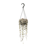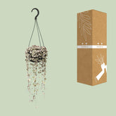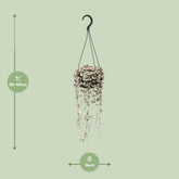 Die Ceropegia woodii, allgemein bekannt als Ceropegia, ist eine faszinierende Zimmerpflanze, die jedem Raum sofort eine Note von Eleganz verleiht. Ursprünglich aus dem südlichen Afrika stammend, gedeiht dieses bezaubernde Exemplar auch bei geringem Licht und eignet sich daher perfekt, um dunkle Bereiche aufzuhellen. Mit seinen herzförmigen Blättern an üppigen Ranken ist die Ceropegia eine atemberaubende Ergänzung für jede Pflanzensammlung. Ihre einzigartige hängende Natur macht sie ideal für Hängekörbe oder an Buchregalen herabfallende Pflanzen. Bringen Sie mit dieser charmanten und mühelos schönen Ceropegia-Zimmerpflanze frischen Wind in Ihr Zuhause. Vorstellen möchten wir Ihnen unsere exquisite Ceropegia woodii, eine faszinierende hängende Sukkulente, die jeden Raum mit ihrer einzigartigen Schönheit bereichert. Diese fesselnde Pflanze gedeiht an einem Ort mit teilweisem Schatten und ist daher perfekt für diejenigen, die ihrem Innen- oder Außenparadies etwas Grün hinzufügen möchten. Dank ihrer pflegeleichten Natur muss sie nur alle 8-10 Tage gegossen werden, wodurch sie die ideale Wahl für vielbeschäftigte Pflanzenliebhaber ist. Holen Sie sich noch heute diese atemberaubende Ceropegia woodii nach Hause und genießen Sie ihre bezaubernde Präsenz in den kommenden Jahren. Erleben Sie die mühelose Eleganz der Natur!Wussten Sie, dass die Ceropegia woodii, allgemein bekannt als String-of-Hearts-Pflanze, eine unglaubliche Sukkulente mit Ranken ist, die an zarte Herzchen erinnern? Diese bezaubernde Pflanze stammt aus Südafrika und wird aufgrund ihres eleganten herabhängenden Laubs oft zur Dekoration verwendet. Es ist jedoch wichtig zu beachten, dass Ceropegia woodii ausschließlich für ornamentale Zwecke gedacht ist und nicht zum Verzehr geeignet ist. Bewundern Sie also ihre Schönheit, widerstehen Sie jedoch der Versuchung, davon zu naschen, und lassen Sie sie stattdessen in Ihrer Dekoration erblühen!- Ceropegia woodii hat eine Topfgröße von 14 cm.- Die Pflanze ist etwa 38 cm hoch und ist daher eine kleine und kompakte Art.- Ceropegia woodii ssp. woodii ist auch einfach als Ceropegia bekannt.- Diese Pflanze gedeiht an einem Ort mit halbschattiger Lage und eignet sich daher für den Innenbereich oder für Außenbereiche mit gefiltertem Sonnenlicht.- Eine interessante Tatsache über Ceropegia ist, dass ihre einzigartigen herzförmigen Blätter an langen Ranken dazu geführt haben, dass sie Spitznamen wie "String of Hearts" oder "Rosary Vine" erhalten hat.